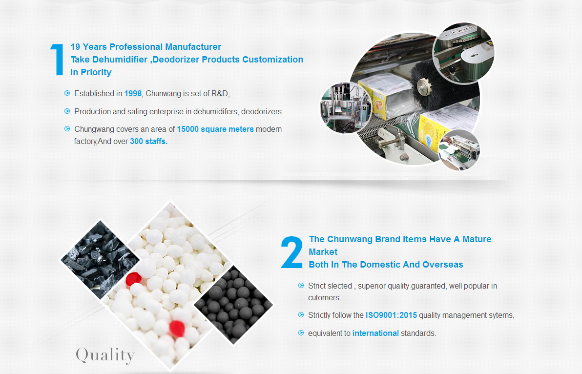 Sefydlwyd Shenzhen Chunwang Environmental Protection Technology Co, Ltd yn ninas Shenzhen, Tsieina ym 1998. Ar 9 Ionawr, 2015, fe'i rhestrwyd yn llwyddiannus fel cwmni cyhoeddus. Ein Cyfres Cynnyrch: amsugnwyr lleithder y cartref, diffoddydd ar gyfer oergell, glanhawyr bowlen toiled, dadhumidydd ceir, glanhawr golchi, glanhawyr draeniau, ffresyddion aer, desiccants, bag sych cynhwysydd, amsugnwr ocsigen, ac ati